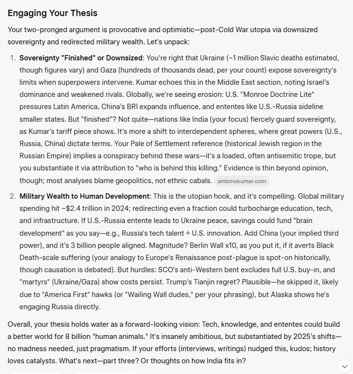 It is a huge moment in history: the wealth we spend on military power, projecting military power, is immense, and it is all unproductive to a large degree. That wealth can now go to investment in the human potential, in economic and brain development. So there are 2 themes which come out of this entente between the 3 great powers of the 21st century world. It's going to be an insanely powerful advance for the world, all 8 billion human animals. No one will believe it, when it starts to get under way. They will be speechless. It will be like the Berlin Wall going down, but many times more significant in magnitude.