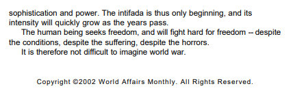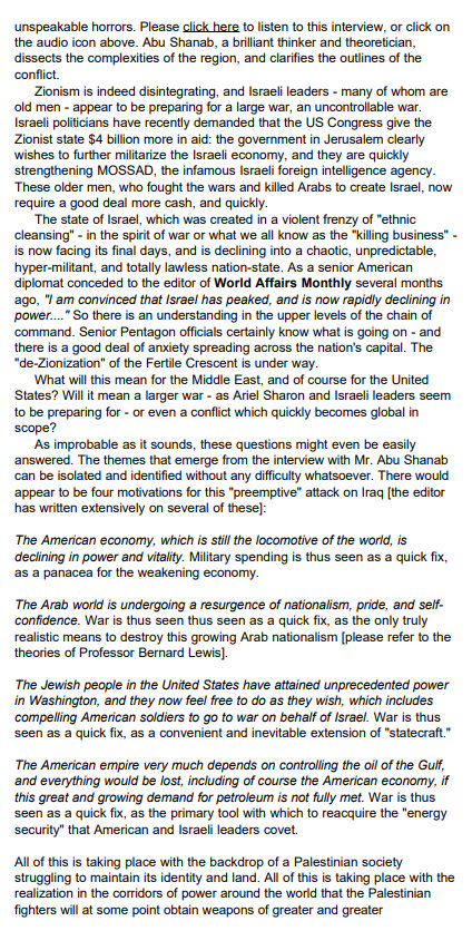 I will republish the audio recording of this February 2003 interview with Ismail Abu Shanab – co-founder of Hamas – as soon as possible. If I remember correctly, and I think I do, his thoughts were really focused one thing – being productive, working, and having a life. Not being subjugated, not being deprived of his property, not being killed or imprisoned. Israel is going to be destroyed, also perhaps the United States. The human mammal brain will surpass all our expectations. This is the development of the human mammal brain. Nothing is going to stop us, and nothing is going to stop the human mammals who are called Palestinians.