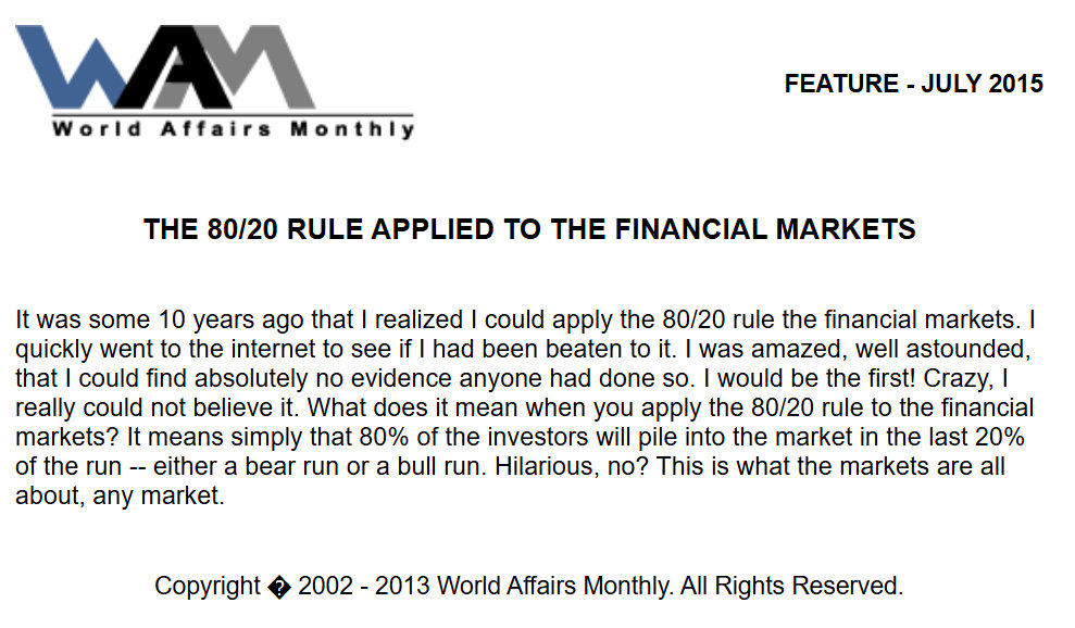 80% of investors buy into the bull market in the last 20% of the bull market. That's in the bull market. In the bear market what happens is investors will sell in the last 20% of the bear market.