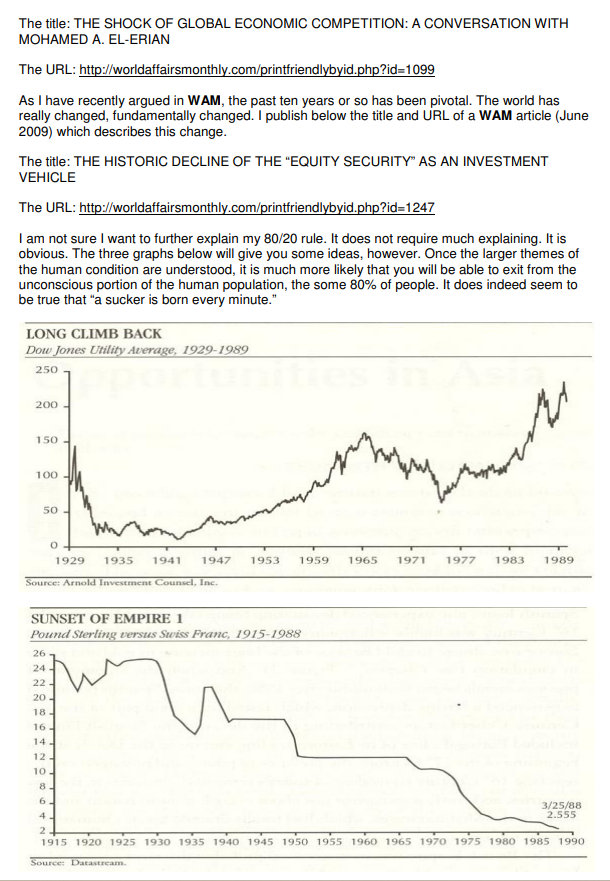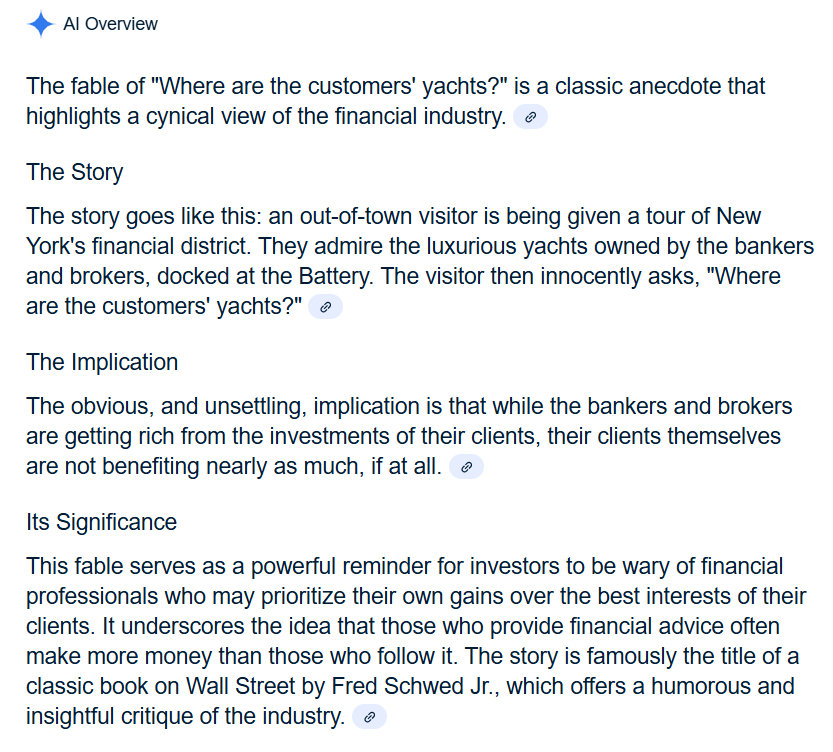 My friend John Bogle did make his contribution to the effort to increase the intelligence of the 80%. John was the founder of Vanguard Investments. But there is a great and very funny story of the out of town guy visiting Wall Street and Lower Manhattan. He saw all the yachts, and then asked innocently, “where are the customers' yachts?”