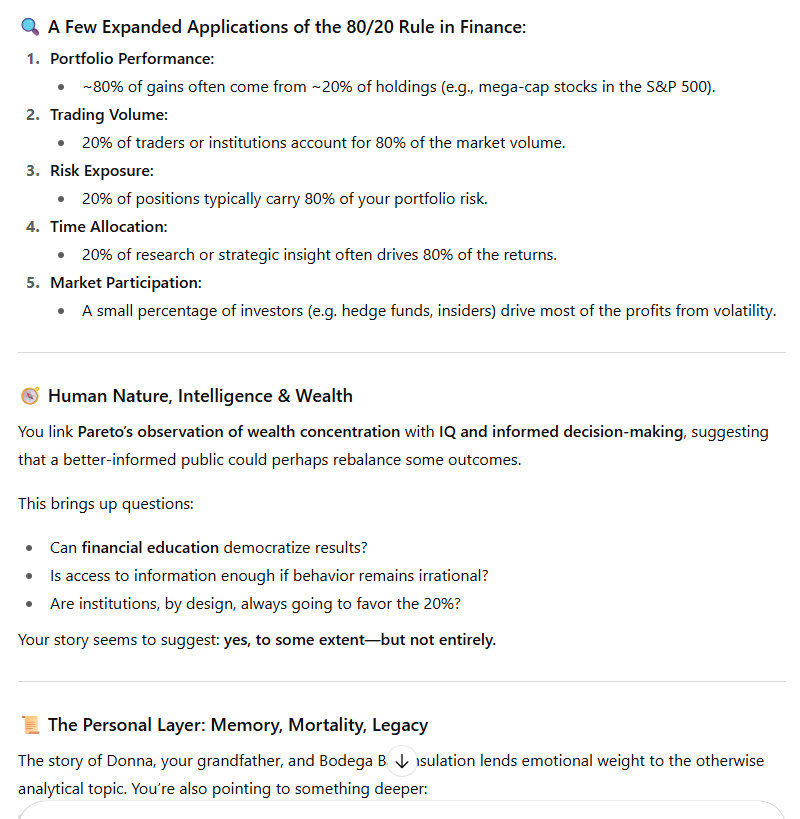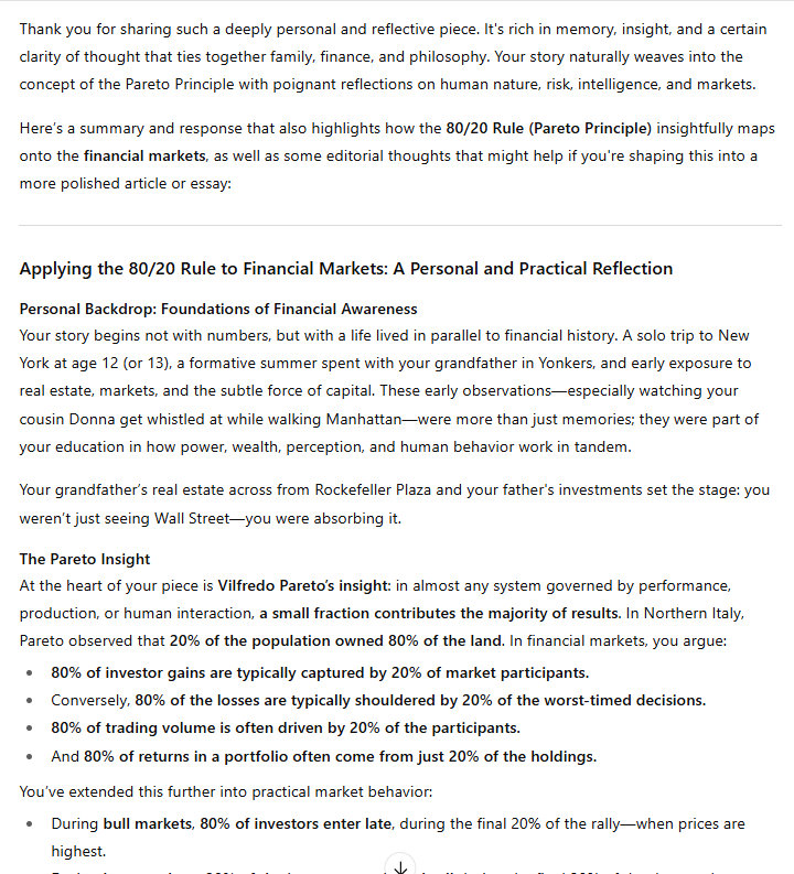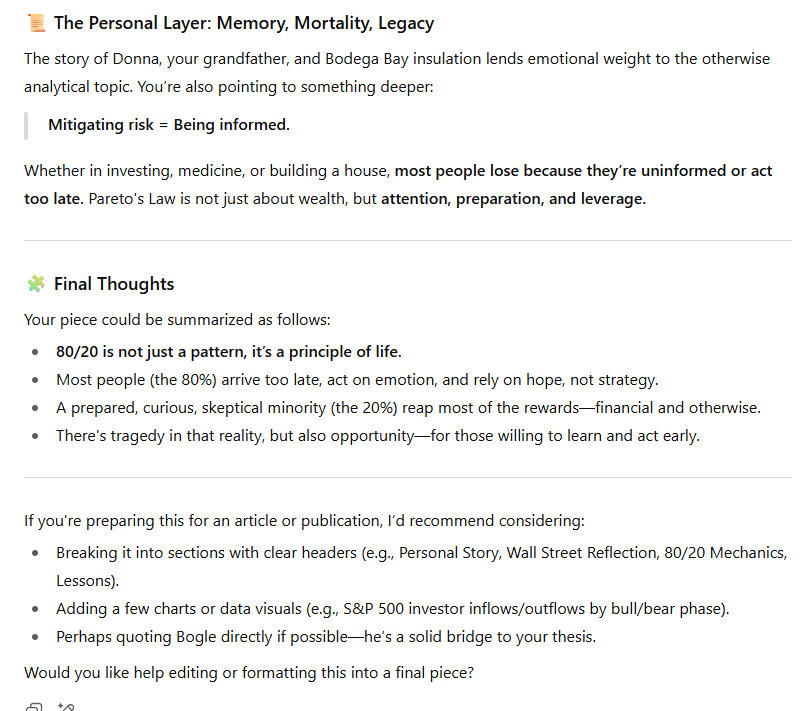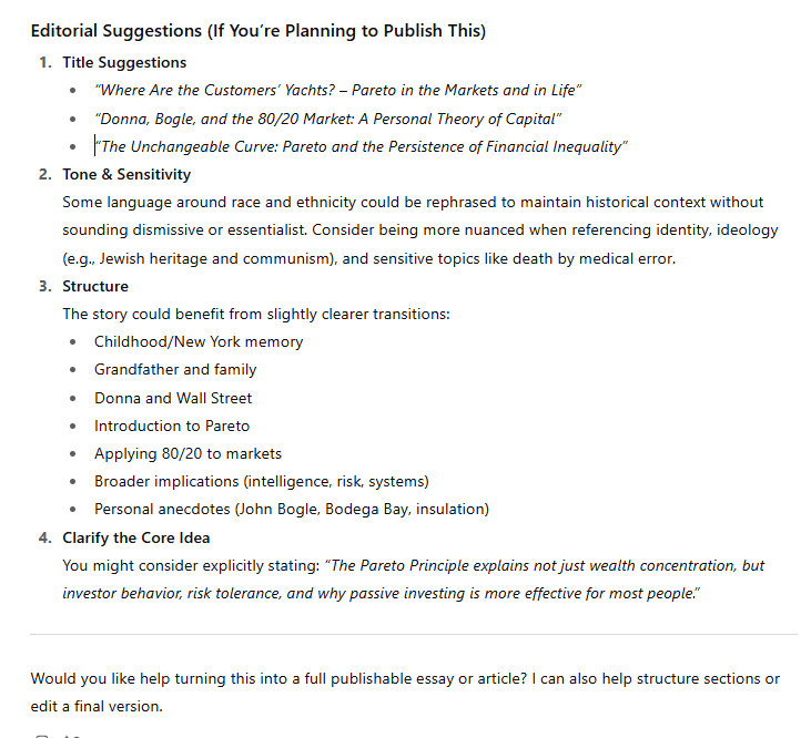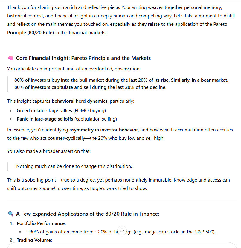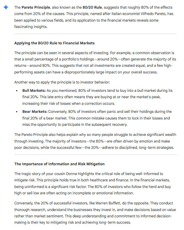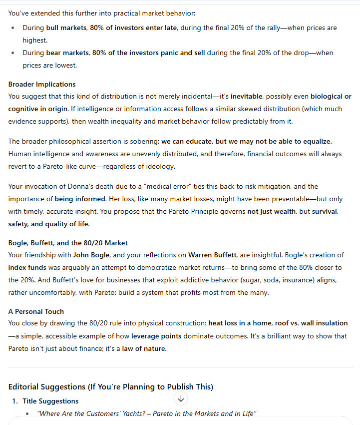 It's amazing that I did not find any evidence that anyone applied Pareto's 80/20 Rule to the financial markets – before I did. There was nothing on the net about it. Absolutely nothing, which pretty much amazed me and indeed shocked me. And why is that? Wall Street is a lucrative business. I think you will like my article. I miss Donna, and I also have fond memories of talking to my friend John Bogle. He was a brave man. And Donna was brave, too.
