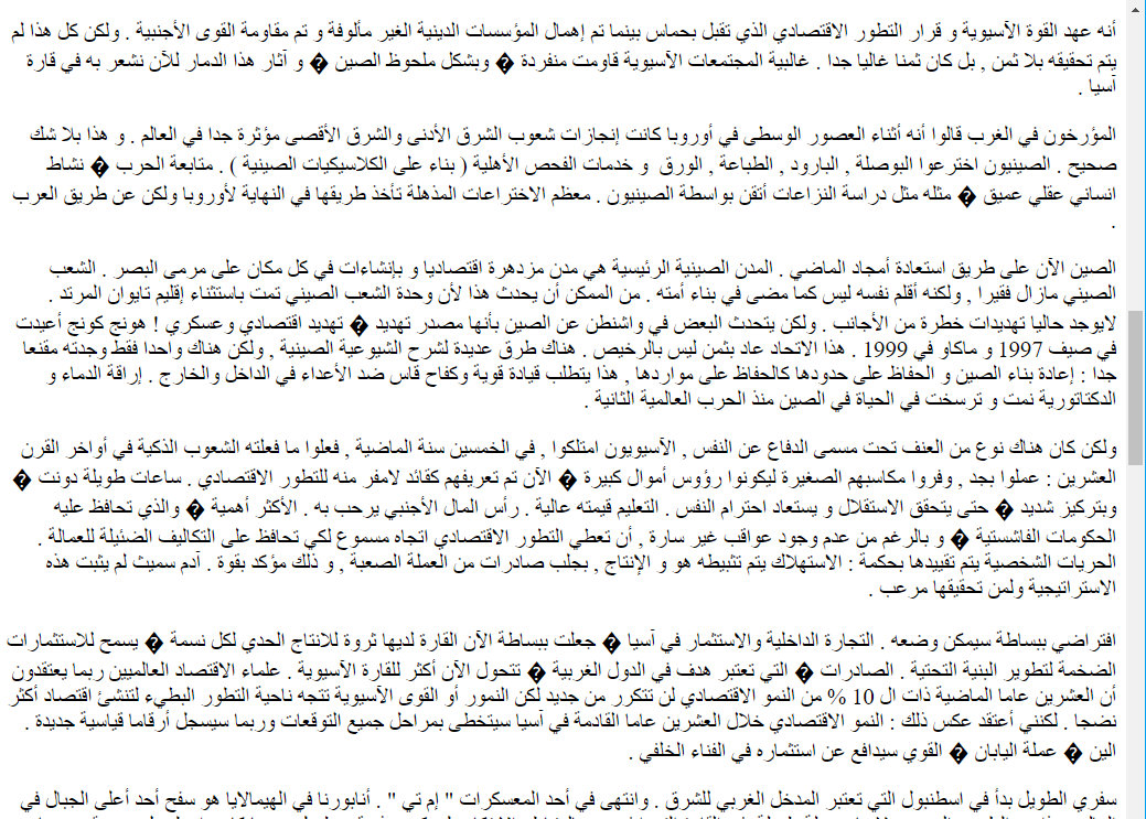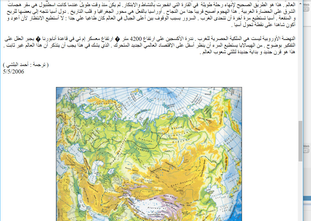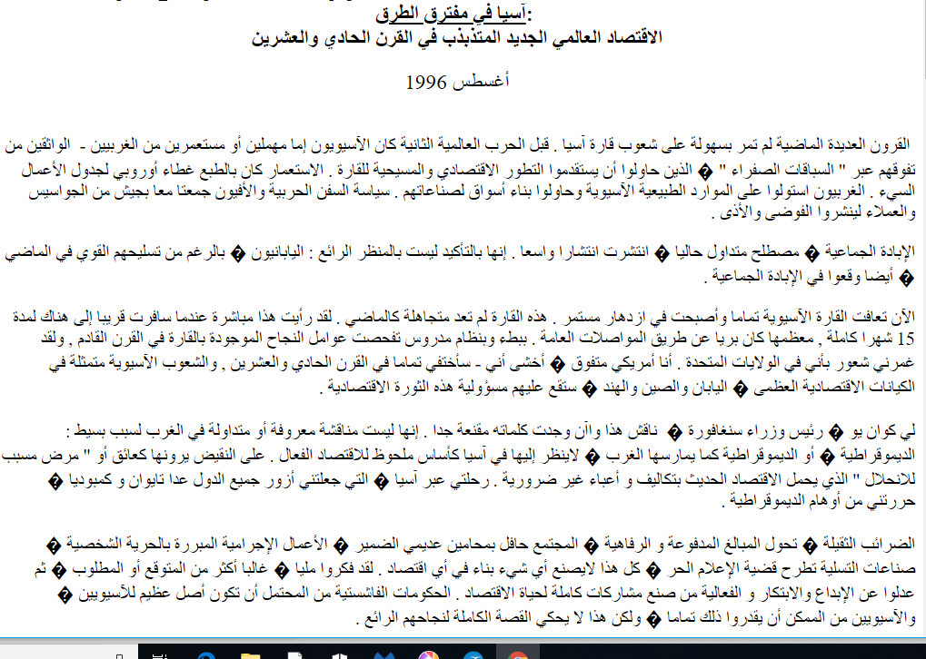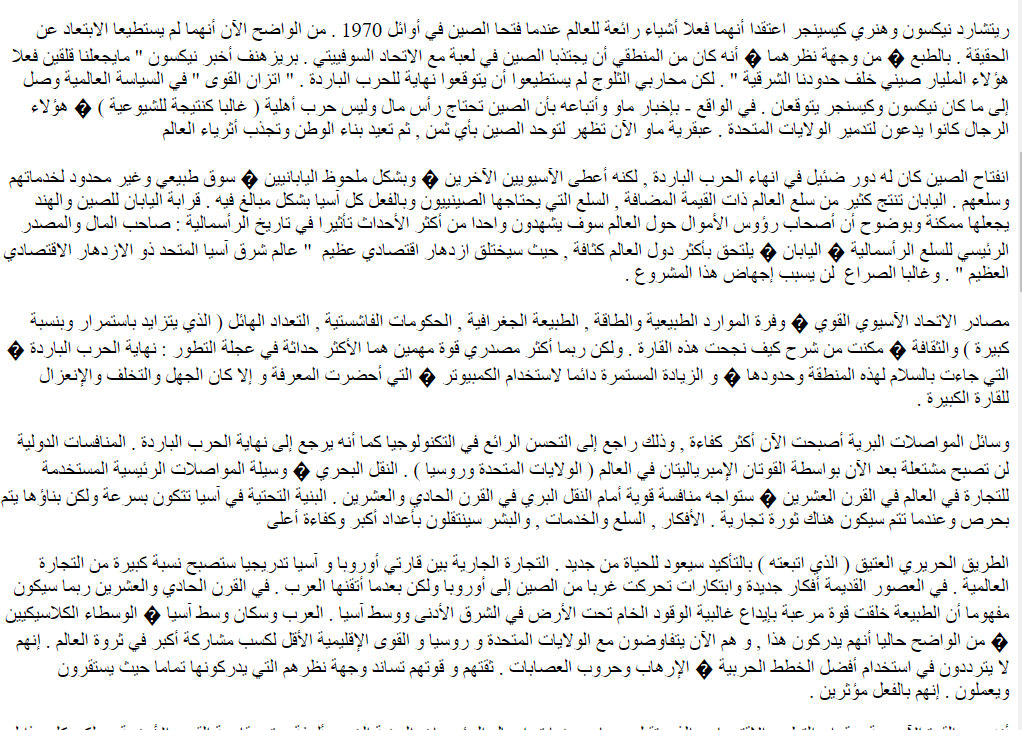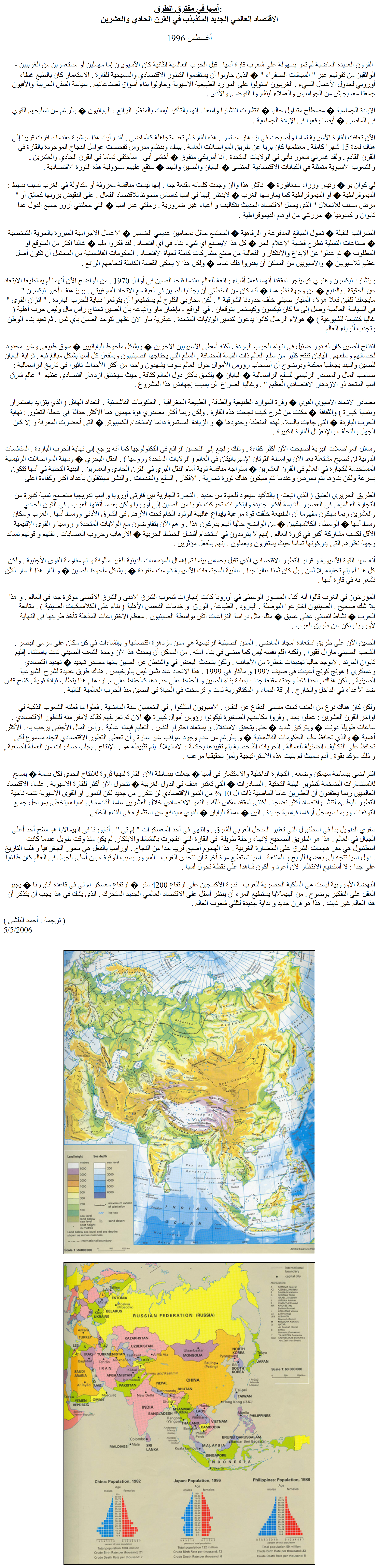 My web site software is very sophisticated but I did not ask the developers to allow for languages other than English. Do I need these? Perhaps I will in the future but for now I will publish translations as images. This should be fine for the time being. I will need full-time translators and translation is very difficult and so far I see little need to go into other languages. I predict however that I will likely offer this in the future. Below is the Arabic translation of my article Asia at the Crossroads: The World's New Economic Locomotive of the 21st Century [August 1996]. Excuse me for the occasional messy text, this was the unfortunate result of hackers who were determined to destroy my web site. I will try to correct this as soon as possible and provide a clean image of the text.
