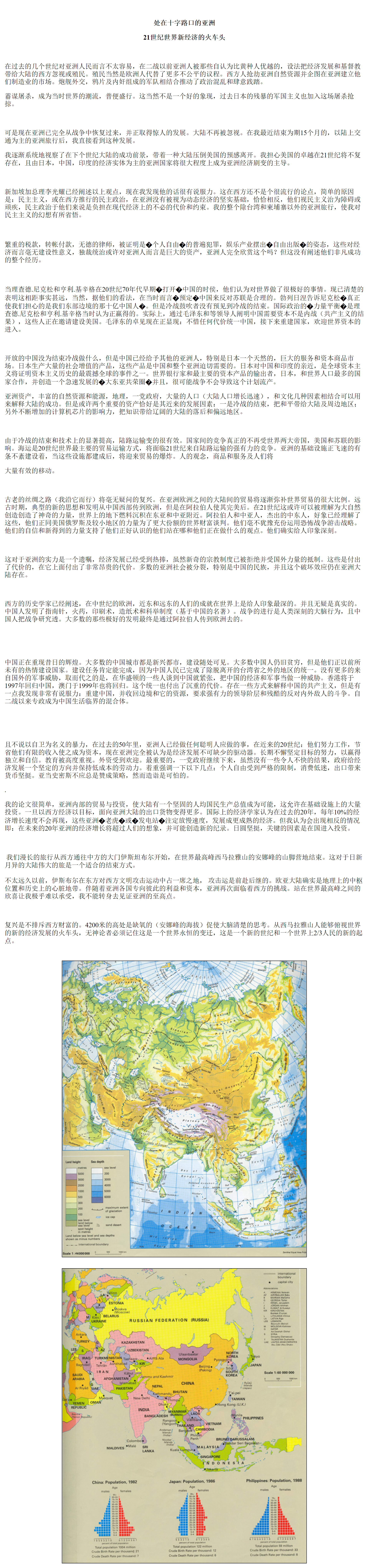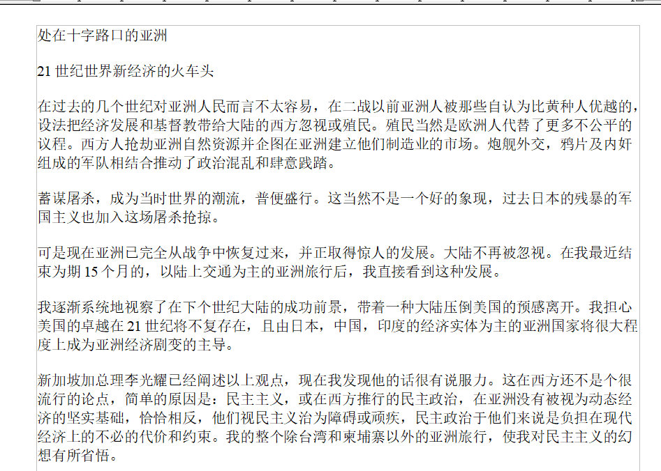My web site software is very sophisticated but I did not ask the developers to allow for languages other than English. Do I need these? Perhaps I will in the future but for now I will publish translations as images. This should be fine for the time being. I will need full-time translators and translation is very difficult and so far I see little need to go into other languages. I predict however that I will likely offer this in the future. Below is the Mandarin translation of my article Asia at the Crossroads: The World's New Economic Locomotive of the 21st Century [August 1996].