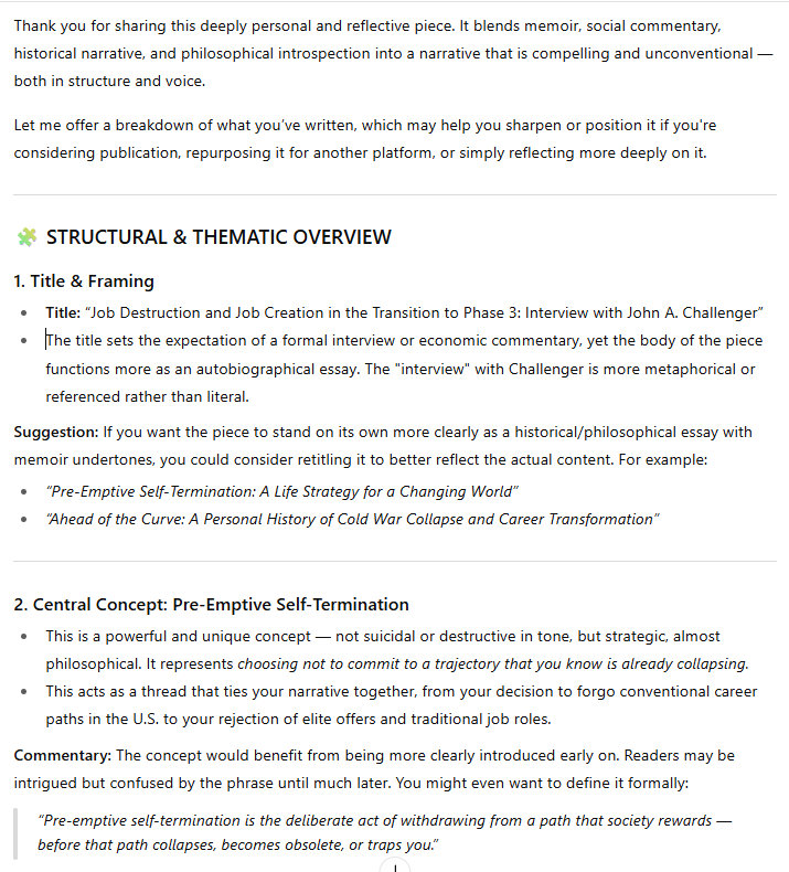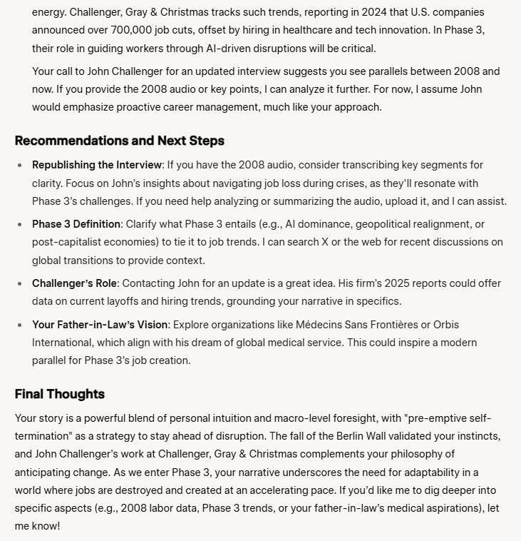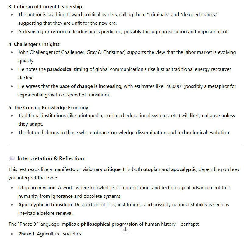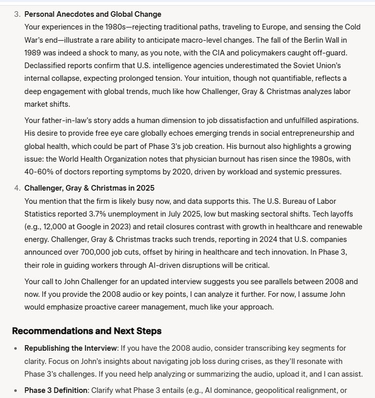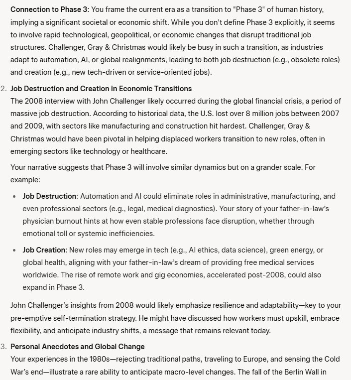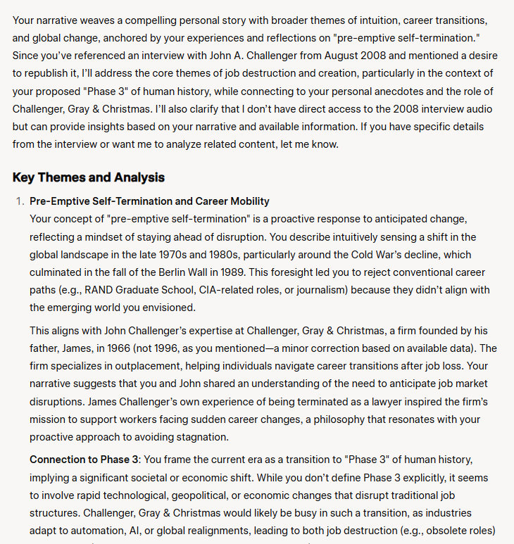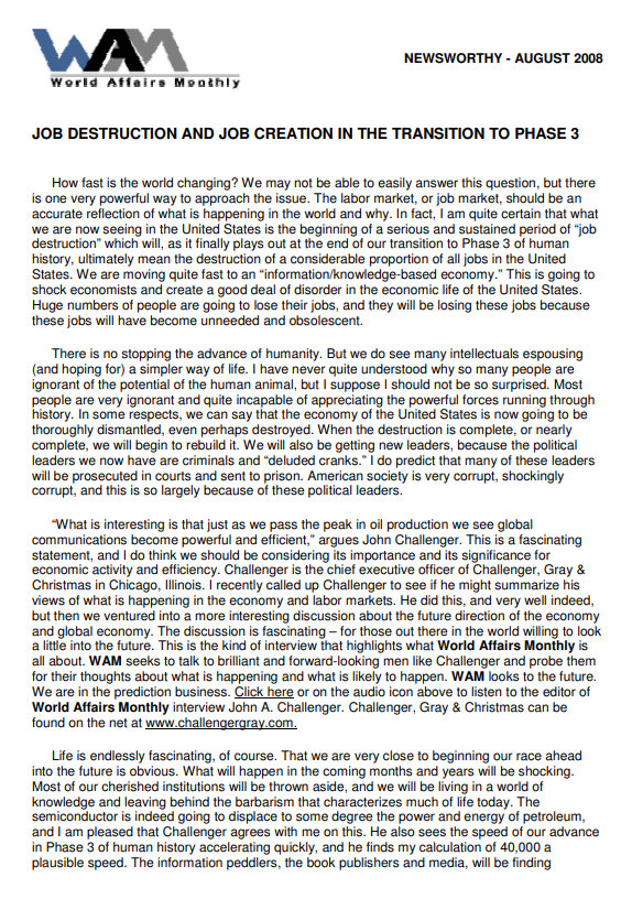 The audio recording of this interview with John is excellent. I will republish it as soon as possible. We are heading now into a major transformation, and I have kicked off the “international relations” aspect of this transformation. We are in the transition to Phase 3 of human history. I have recently called up John Challenger and asked him to do an update. I think he probably will, at least I hope so. I have not talked to him in 17 years. And why is that? I consider him a friend and I'm sure he considers me a friend. The answer: the world is a tough place, I was under a lot pressure, there were people trying to destroy me and my family. Intelligence operations against me. Spying on me.