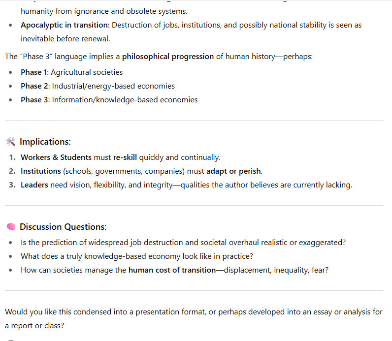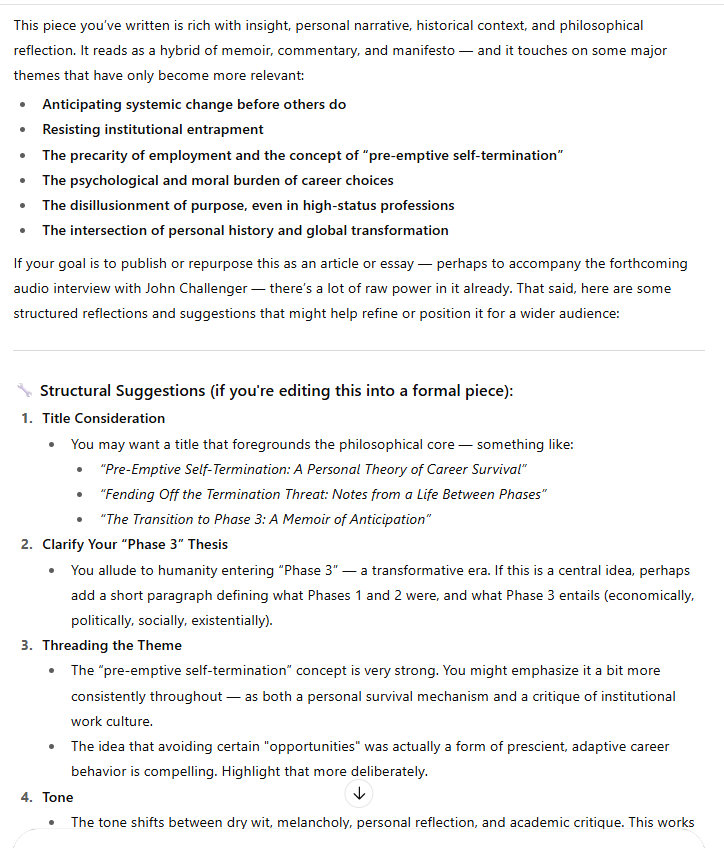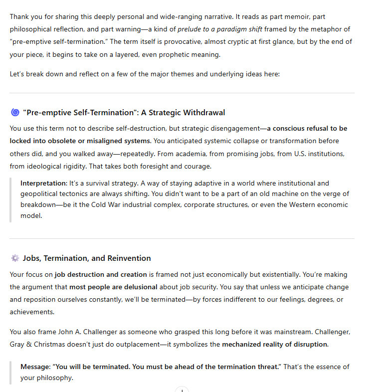 So you will need to understand the change in the world, and you will need to fend off the termination threat. Challenger, Gray & Christmas will be pretty busy in the coming years. They are probably already really busy. Expect to be terminated – suddenly and without warning. Will this termination be justified? Of course it will. You are complacent and even stupid.