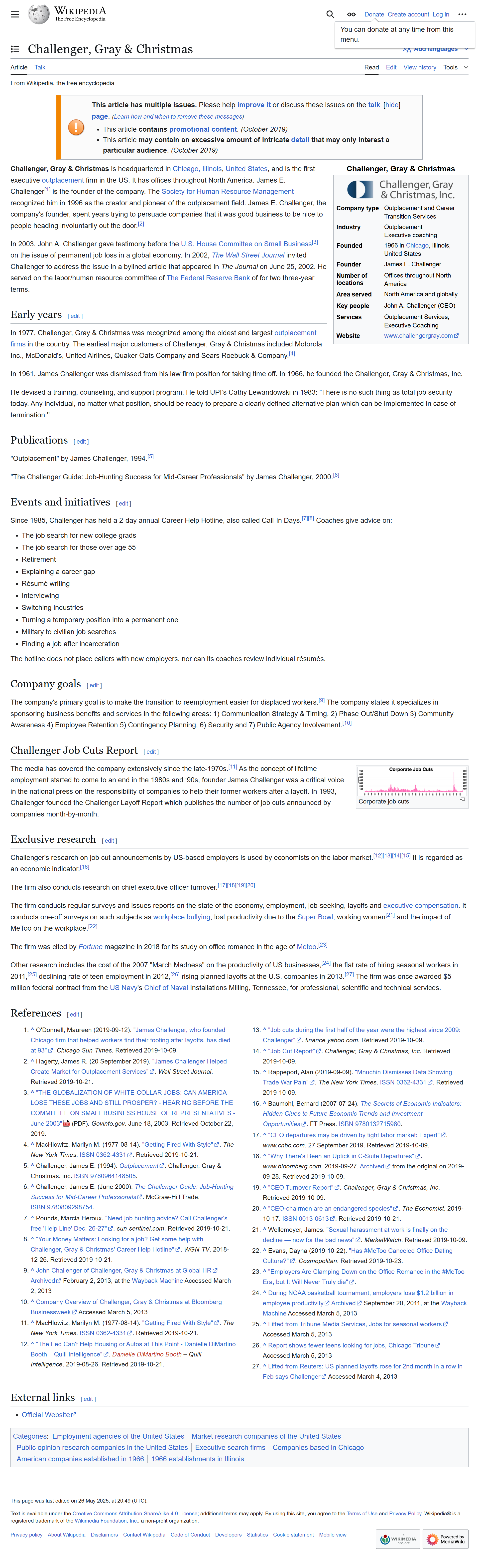 John Challenger is a friend of mine. Great guy. His father, James, started up Challenger, Gray & Christmas in 1966, in Chicago. “The First Outplacement Firm - Built On Helping Companies Do Right & Employees Land Right. Your Trusted Partner For Navigating....”