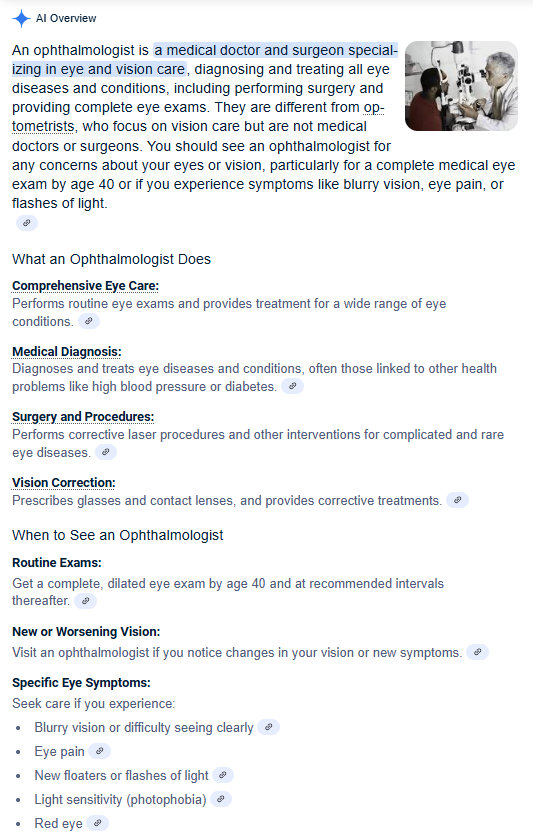 “An ophthalmologist is a medical doctor and surgeon specializing in eye and vision care, diagnosing and treating all eye diseases and conditions, including performing surgery and providing complete eye exams. They are different from optometrists, who focus on vision care but are not medical doctors or surgeons. You should see an ophthalmologist for any concerns about your eyes or vision, particularly for a complete medical eye exam by age 40 or if you experience symptoms like blurry vision, eye pain, or flashes of light.”