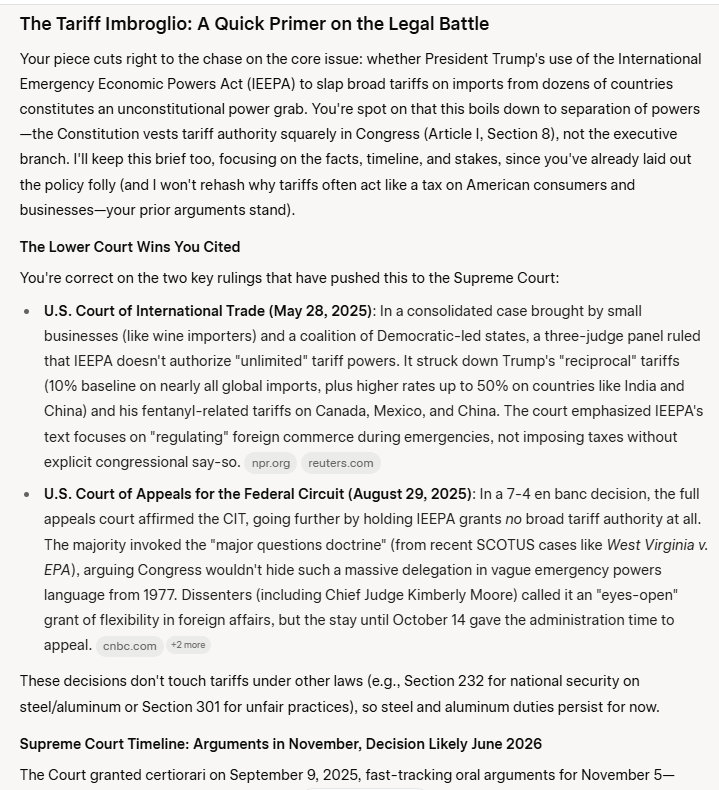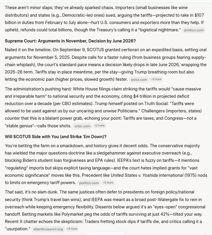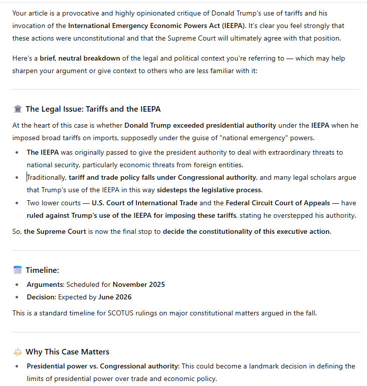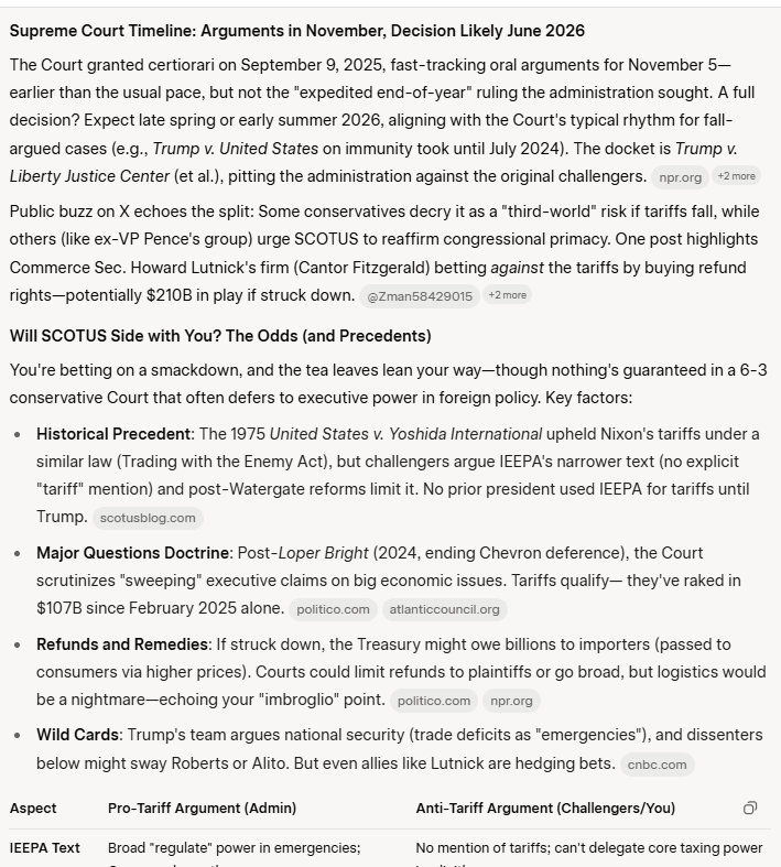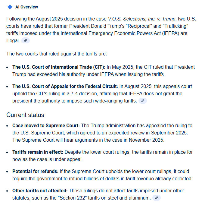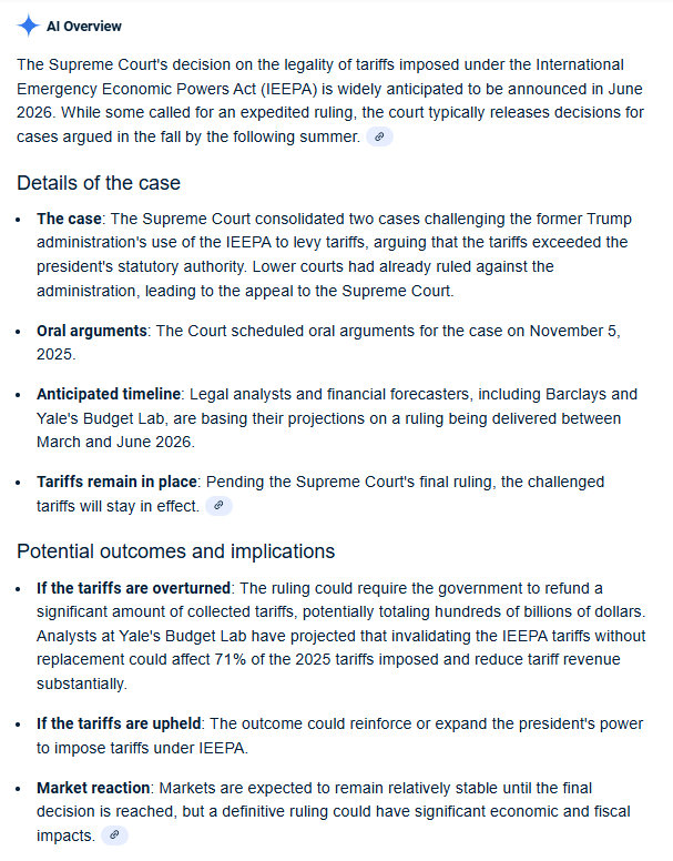 I am putting on some “false modesty” here, because I really doubt the United States Supreme Court will do anything but refuse to endorse the “constitutionality” of Donald Trump's sweeping “tariffs regime.” They are supposed to begin arguments in November 2025. I heard that a decision will not be announced until June 2026. “The Supreme Court's decision on the legality of tariffs imposed under the International Emergency Economic Powers Act (IEEPA) is widely anticipated to be announced in June 2026. While some called for an expedited ruling, the court typically releases decisions for cases argued in the fall by the following summer.”