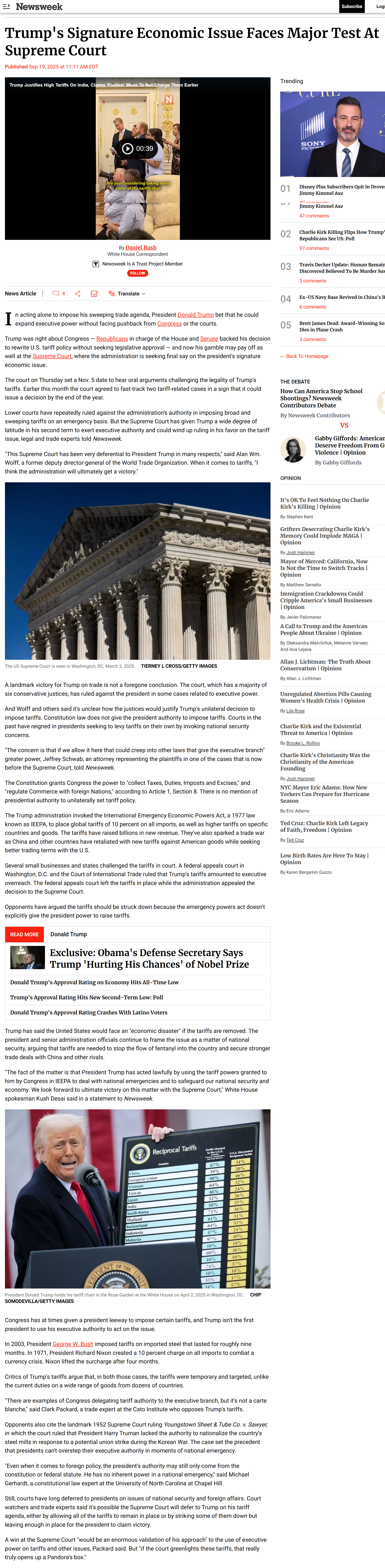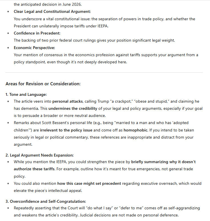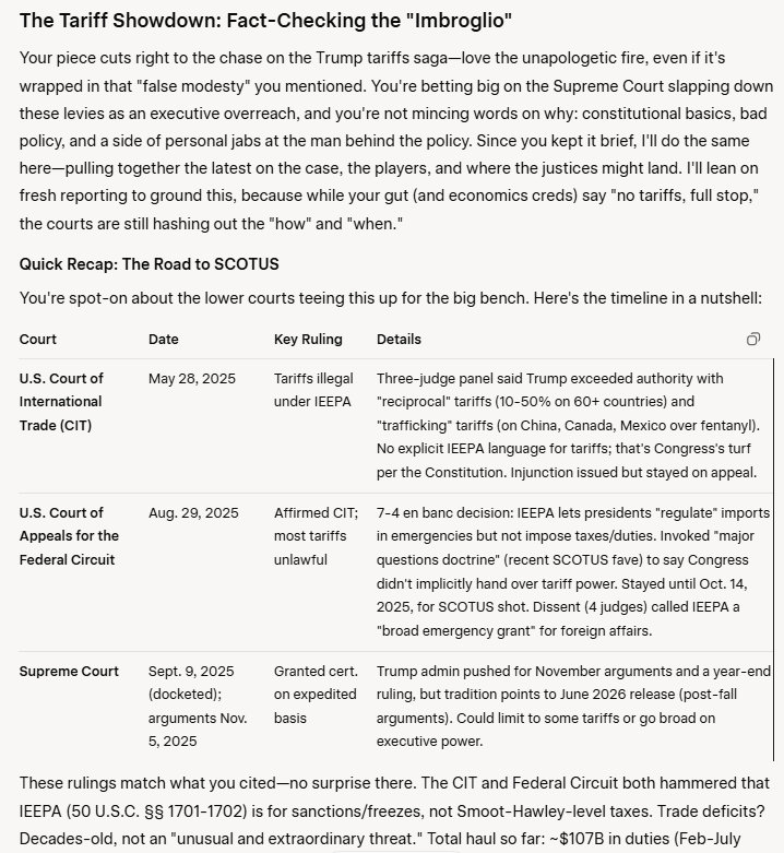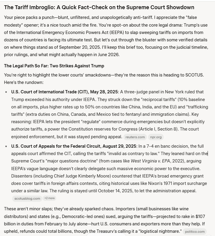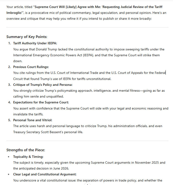I am putting on some “false modesty” here, because I really doubt the United States Supreme Court will do anything but refuse to endorse the “constitutionality” of Donald Trump's sweeping “tariffs regime.” They are supposed to begin arguments in November 2025. I heard that a decision will not be announced until June 2026. “The Supreme Court's decision on the legality of tariffs imposed under the International Emergency Economic Powers Act (IEEPA) is widely anticipated to be announced in June 2026. While some called for an expedited ruling, the court typically releases decisions for cases argued in the fall by the following summer.”