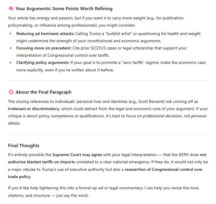 I do not intend this article to go on very long. I will keep it brief. The fundamental issue I will raise here is Donald Trump's “authority” to impose these tariffs – tariffs on everything. He most definitely does not have the authority to do this. The United States is a Republic, it is not a dictatorship or one-man rule. The head of state in such a Republic must fulfill his obligation to consult with the other representatives of the people. Trump believes he is some “stable genius” and while he does effectively get his policy ideas resonating with the public – to some degree he does achieve this – overall it does appear that he's very much incompetent as a policymaker. My colleagues in the economics profession all agree with me that tariffs are stupid policy. I am not going to argue here why they are stupid policy; I have done so already numerous times, so you need to just go examine my arguments.