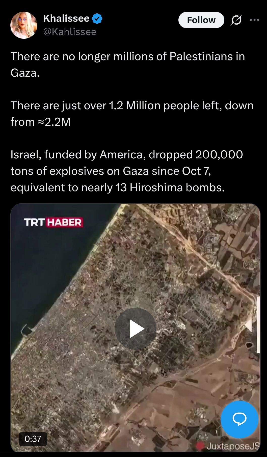 Very likely the “peace agreement” with Hamas was agreed mostly because of me. The Zionist Jews have basically capitulated. Yes, they massacred possibly up to 1,000,000 Palestinians in Gaza. As I have said many times, people can now understand why this “genome” was herded in ghettos in Europe some 500 years ago. And why Catherine the Great decided to put them into the Pale of Settlement. Why was it me? Because Hamas was winning, and Israel is disintegrating. Trump and Netanyahu are big buddies, and they are responsible – along with Joe Biden and Samuel Pisar's stepson Antony Blinken – for the horrendous massacre in Gaza. "It's their [the Jews] land, God gave it to them!" “It's a 3000-year-old conflict!”