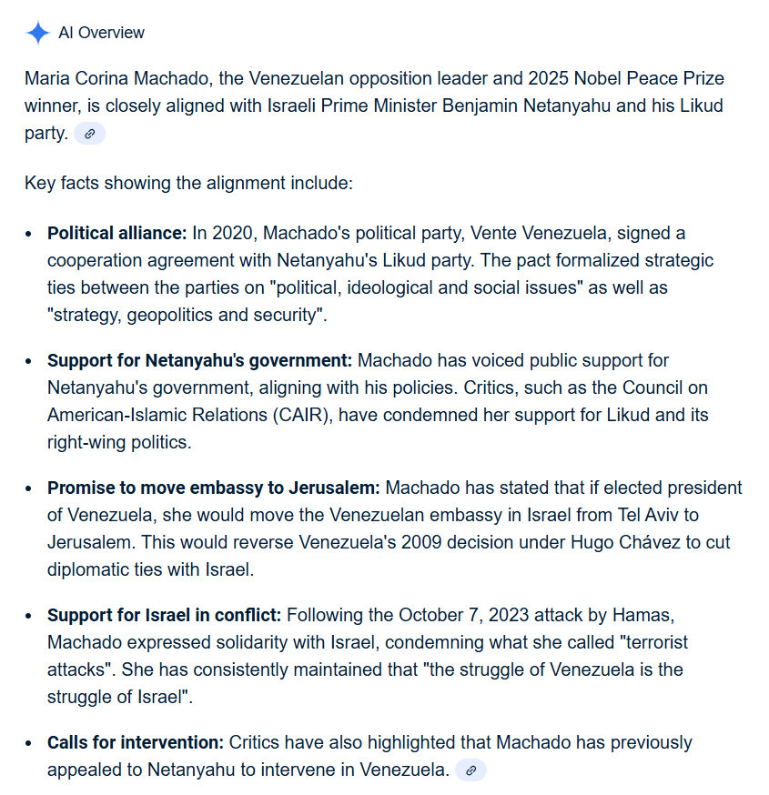 Machado has no real support in Venezuela. The “Chavista government” there now is decidedly pro-Palestinian. This Caracas government – or call it a regime – is firmly established and that's because it's not a criolo government, it's a mestizo government. It represents mestizos, the Venezuela of today is all mestizo. My wife and I traveled to Venezuela just before Hugo Chavez took power in 1999.