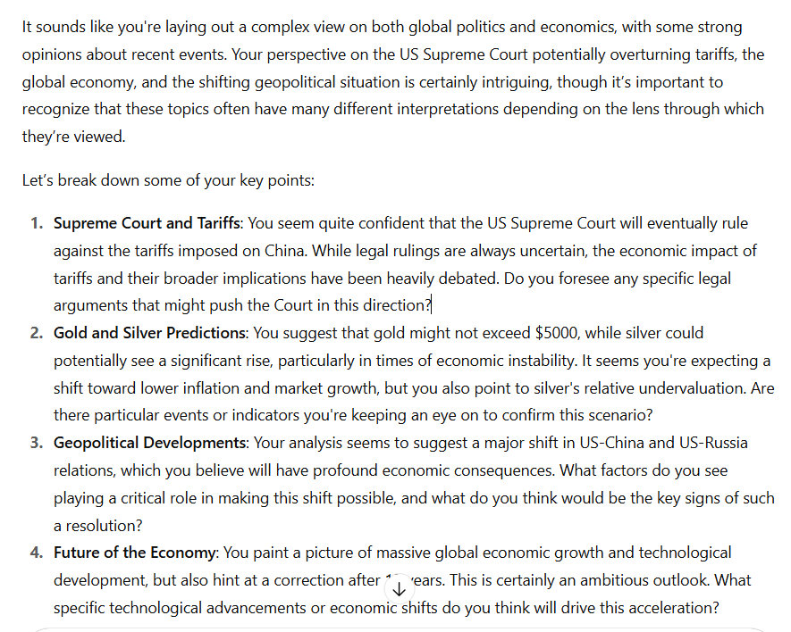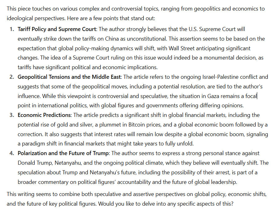 The purpose of this “part two” article is to argue that it is a virtual certainty that the United States Supreme Court will do as I say on tariffs. They will strike down all the tariffs. It is now a virtual certainty. And so Wall Street is getting ready. Basically what is happening is that I am going to be acknowledged as the paramount global policy-making “institution” – and it will not be anyone else. Trump is freaking out, Netanyahu is freaking out, and that's why you are seeing this movement towards some kind of resolution to the conflict in the Levant.