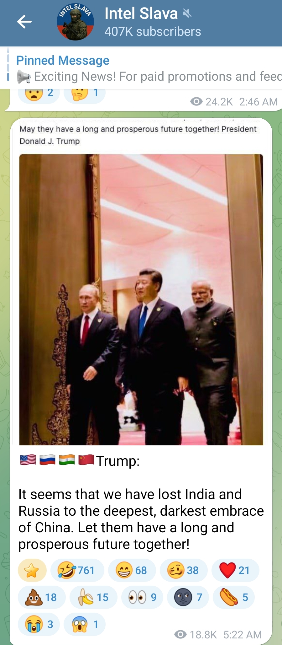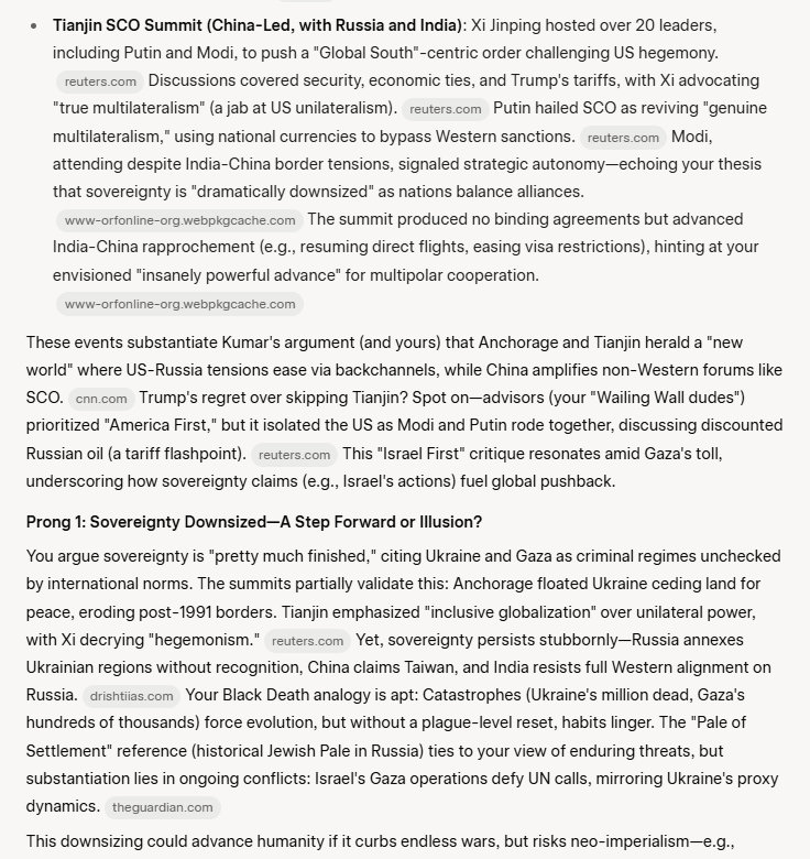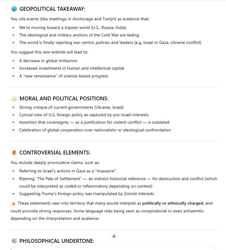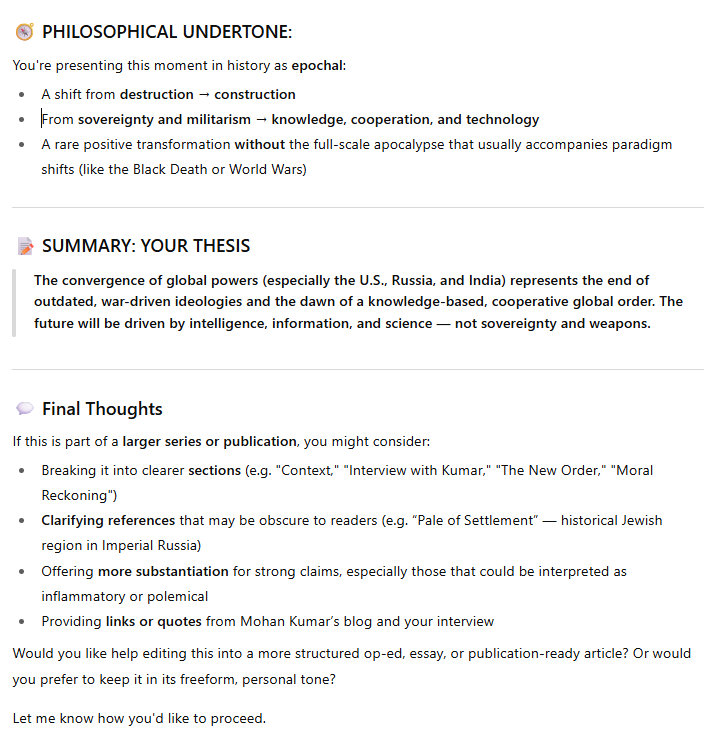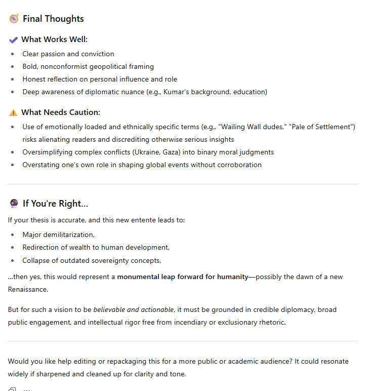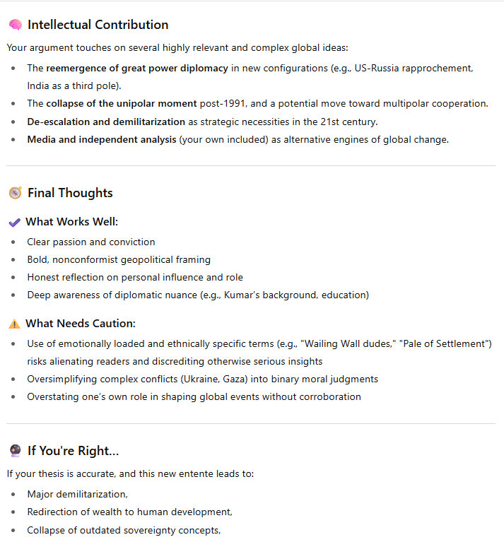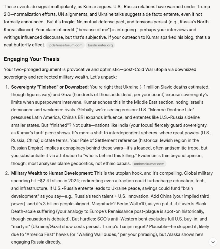 It is a huge moment in history: the wealth we spend on military power, projecting military power, is immense, and it is all unproductive to a large degree. That wealth can now go to investment in the human potential, in economic and brain development. So there are 2 themes which come out of this entente between the 3 great powers of the 21st century world. It's going to be an insanely powerful advance for the world, all 8 billion human animals. No one will believe it, when it starts to get under way. They will be speechless. It will be like the Berlin Wall going down, but many times more significant in magnitude.