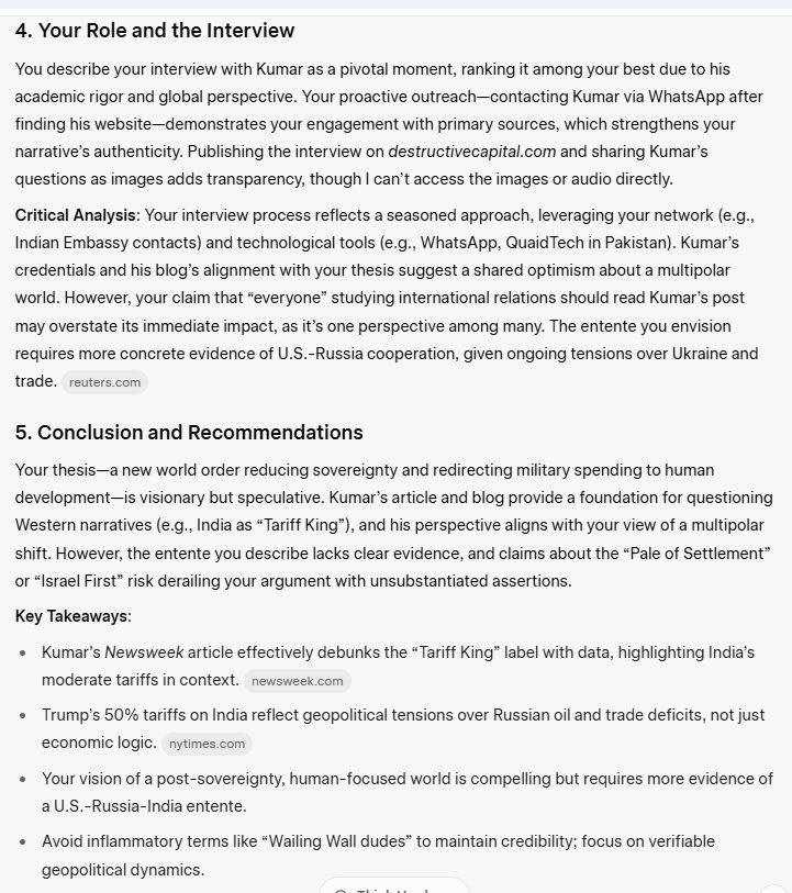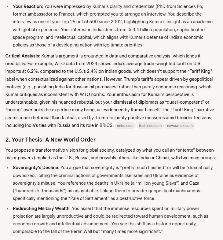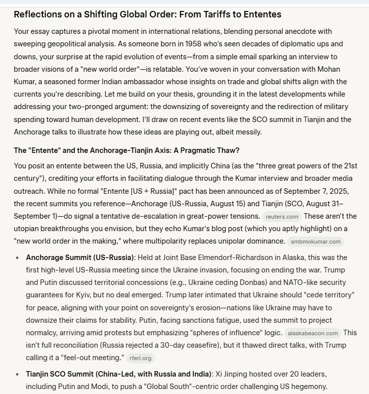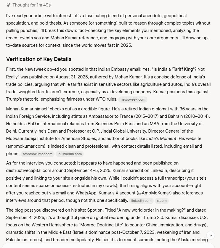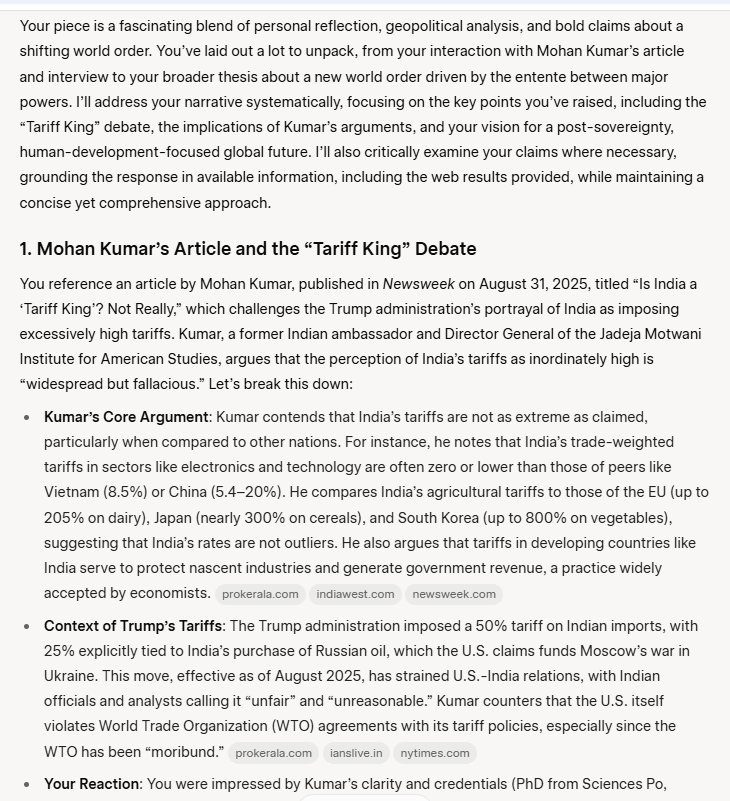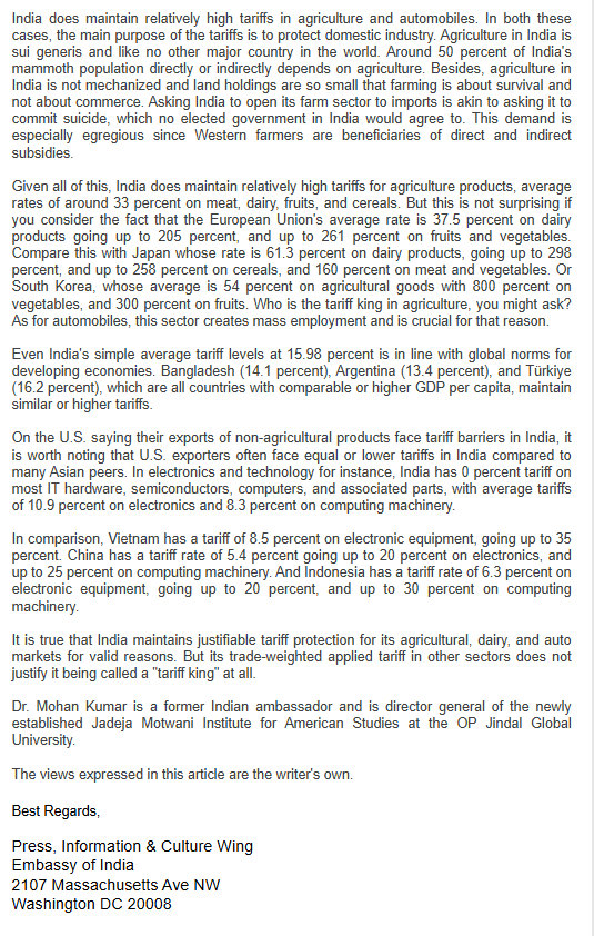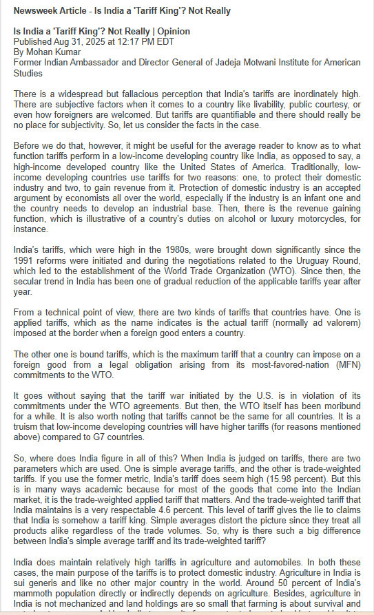 So Wednesday morning I saw an email from my friends at the Embassy. It had an article about Trump's tariffs, about Trump calling India the “Tariff King.” I smiled, and ripped through the article, which was very well written and very brief. It appeared in Newsweek. Its title: Is India a 'Tariff King'? Not Really. Published Aug 31, 2025. I don't read the Newsweek stuff, it is mostly nonsense, but this caught my eye. Its author I had never heard of: Mohan Kumar [former Indian ambassador and now Director General of Jadeja Motwani Institute for American Studies in Delhi].