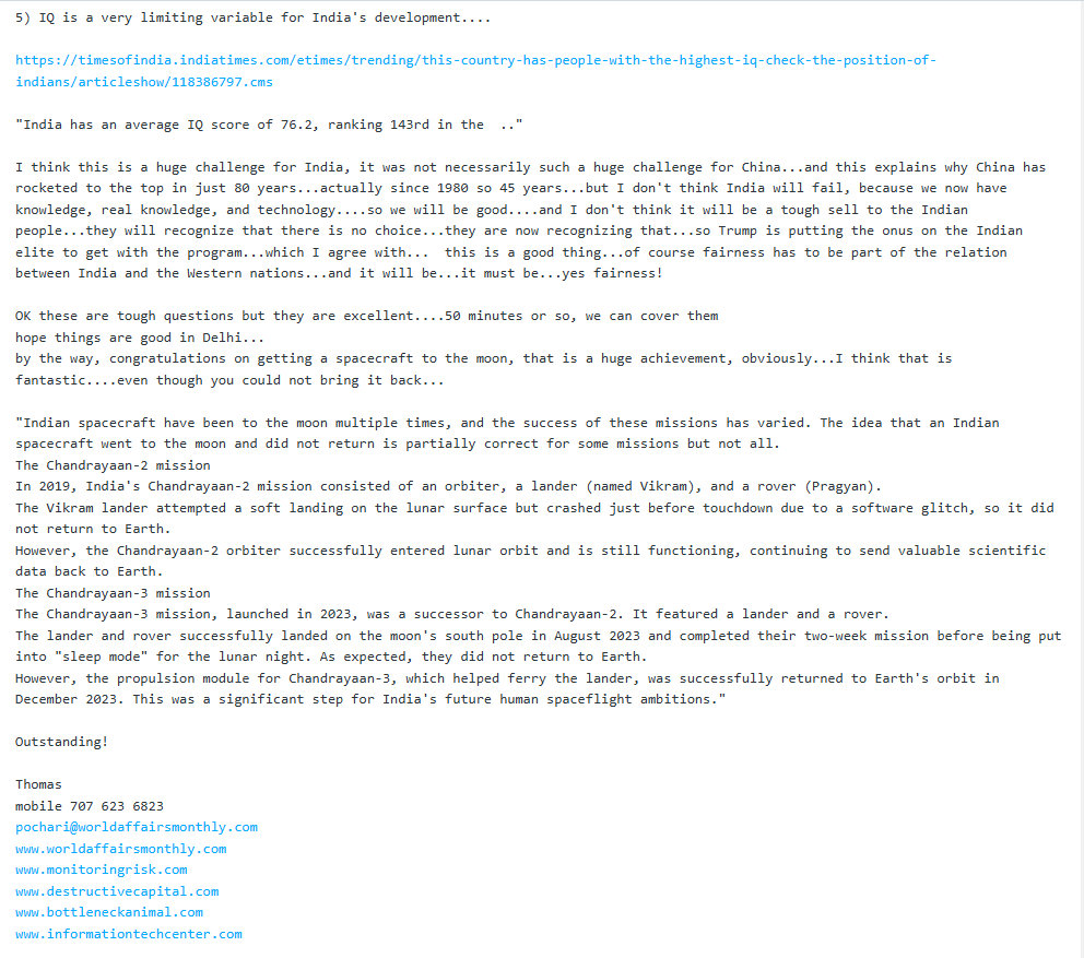 Several years ago, in early 2022, when I was relaunching my media business, I was in touch with the Embassy about an interview with the Indian ambassador. They seemed really interested, but it never did happen. I have always paid close attention to India, they are 1.4 billion people. I am certainly not an expert on India, but my wife and I have been aware of what's going on there since we traveled around India in the mid-1990s. They have a sophisticated space program, and they have some 100 million high IQ Indians. In other words, they cannot be ignored. They are impressive. They work hard, they are serious.